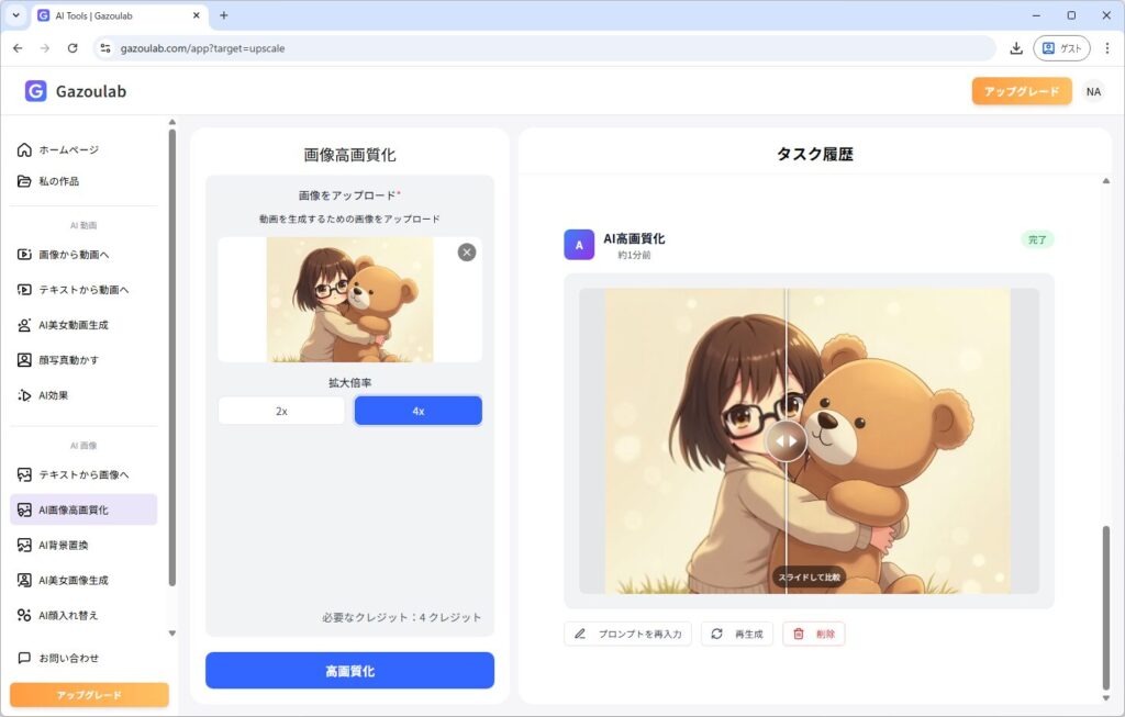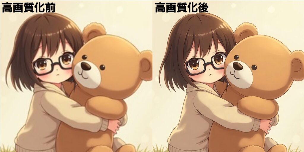 次は、画像を高画質化するAIです。先ほど生成した画像をわざと低画質にして、高画質化を試してみました。