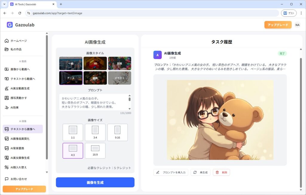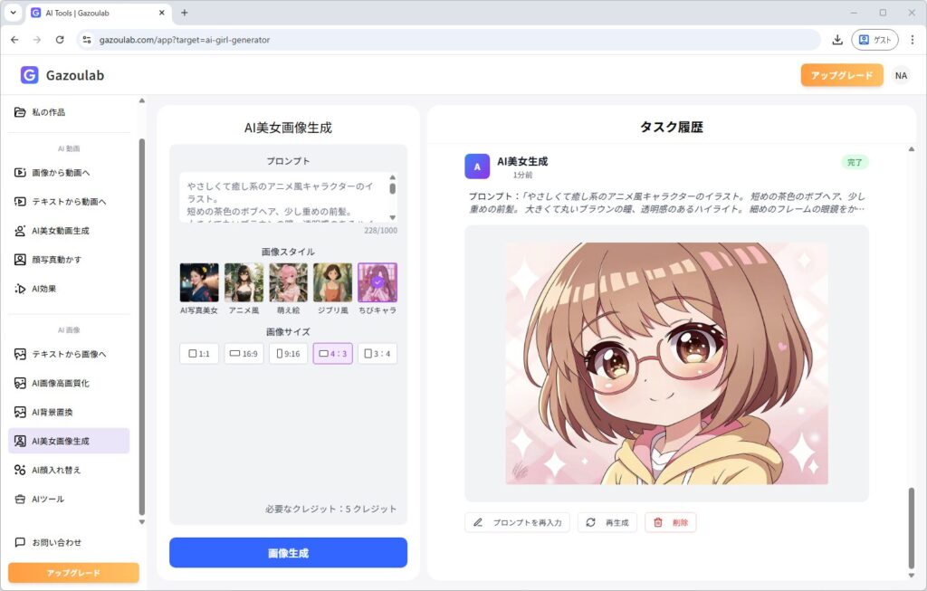 次は、美女画像生成です。画像スタイルはAI写真美女・アニメ風・萌え絵・ジブリ風・ちびキャラの5種類から選ぶことができます。