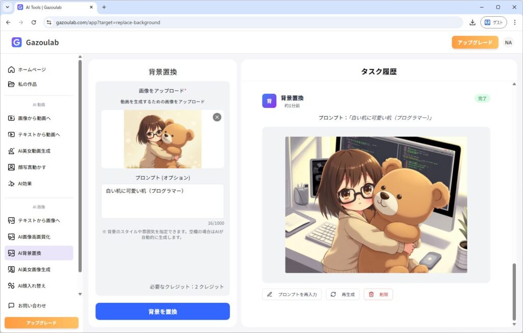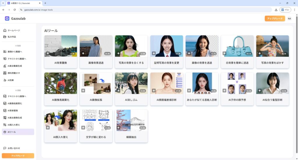 Gazoulabとは、背景透過・画像高画質化、背景生成などをブラウザだけで行う事ができるAI画像編集ツールです。また、画像だけではなく動画にも対応しています!