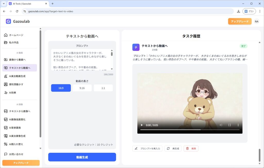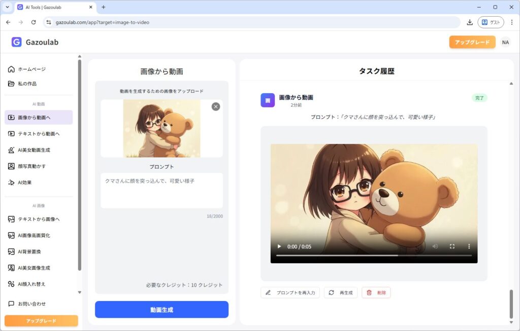 次は、AI動画です。これも最近よくある画像から動画に変換する機能です。