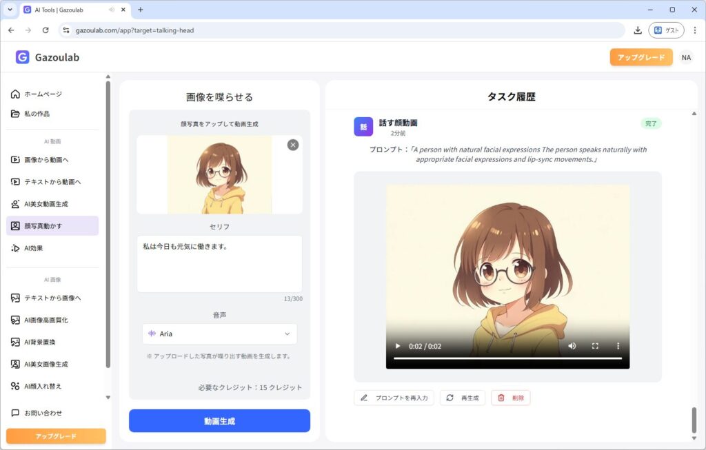 次に、画像をアップロードして口パクをさせる機能です。セリフと音声(誰の声か)を指定して、生成することができます。