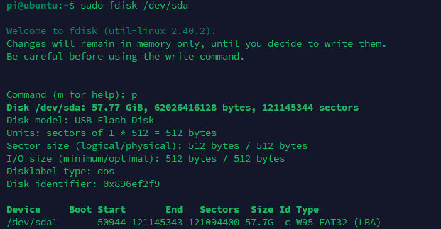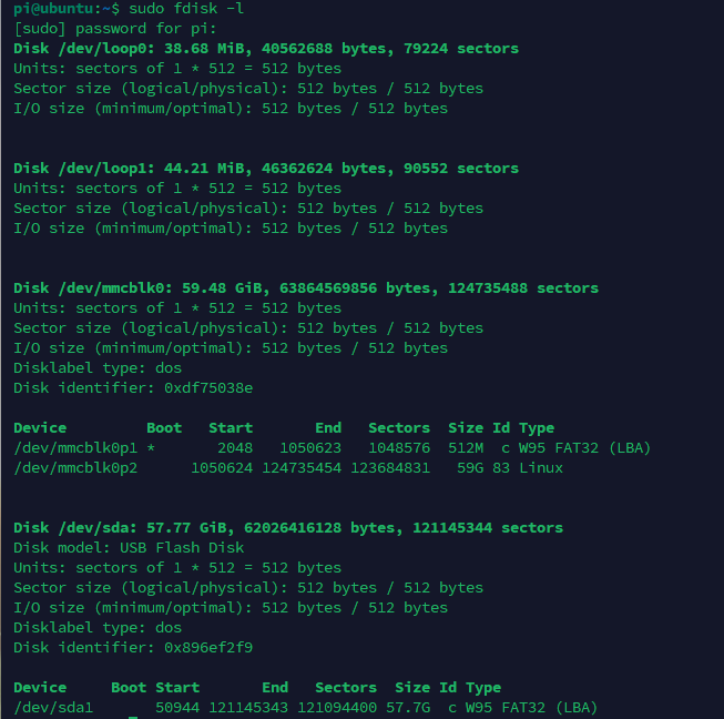 まず、Ubuntu側にUSBをマウントするところから始めます。以下のコマンドで、パーティション情報を表示できます。今回指しているUSBは、/dev/sda1というデバイス名らしいです。
