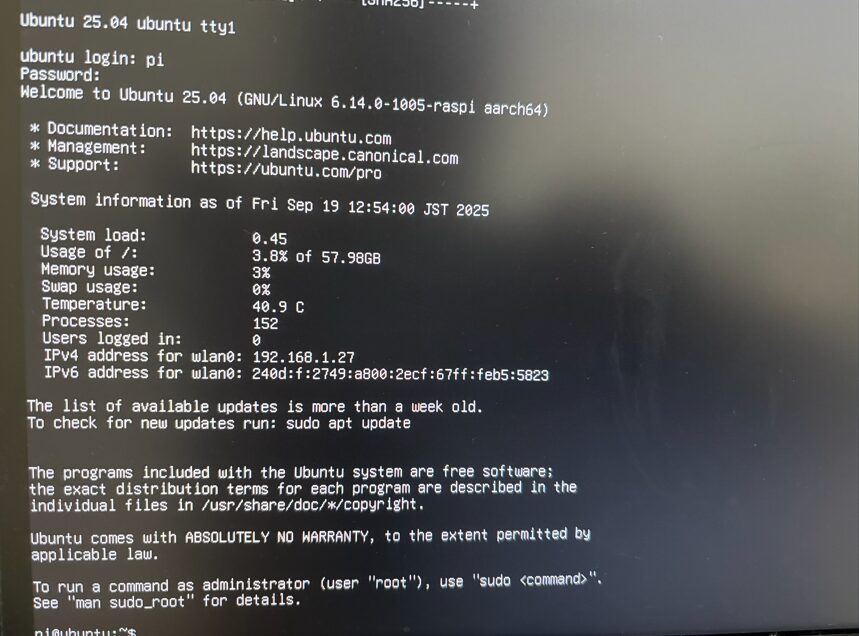 microSDカードには、なにも入っていないのでRaspberry Pi ImagerでOSをインストールします。今回は、Ubuntu 25.04をインストールしました。
