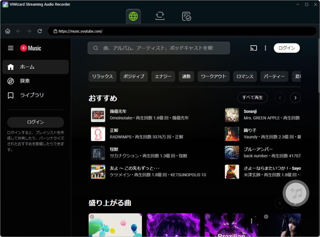 すると、YouTube Musicの画面が表示されます。このソフトは、各サービスでログインしている状態でないとダウンロードが出来ないみたいなので、先にGoogleアカウントでYouTube Musicにログインしておきます。